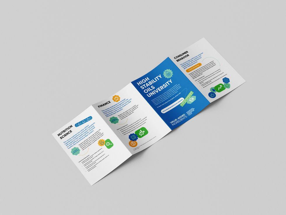 Corteva partnered with universities and colleges across the U.S. to educate students about value-added ingredients featured in their campus dining halls. The brochure’s concept took inspiration from academic course catalogs, where each topic was presented as a “course,” making the information engaging and approachable. The design incorporated a series of playful, sticker-inspired graphics to resonate with the youth. These sticker and arrow elements reflected the way students personalize their belongings, like water bottles, laptops, and notebooks, adding a fun, relatable, and authentic touch to the overall design.